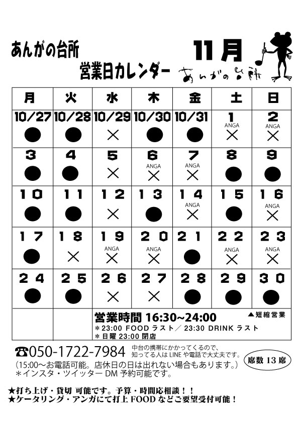 家庭料理とおばんざいとお酒「あんがの台所」の本店舗が決まりました。10/6(日)OPENになります。昔からの夢でありました居酒屋さんを開店することが出来ました。3月からレンタルスペースをお借りし、月に4回程度の営業でした。色々な縁が重なり、最初にやりたいと思っていた場所でオープンする運びとなりました。この縁を大事に毎日を重ねていきたいと思っております。懐にあったかい料金と美味しい食べ物でお家に帰ったようなお店を目指し頑張ろうと思ってます。場所は道路挟んでアンガの裏側になります。ライブ前、打ち上げなどにもぜひ。LIVE HOUSE ANGAのお仕事もありますので、週末など時間帯が不規則になりますが、毎月スケジュールを出しますのでチェックしてきてください。たくさん来てください。メニューは季節や気分に応じてちょいちょい変えていく予定です。席数が少なめなので、来るよって方はご予約いただけると心構えができますので、助かります。尚、OPEN日は完全予約制になっております。どうぞよろしくお願いします。各SNSで情報発信予定です。女将 中台奈央美