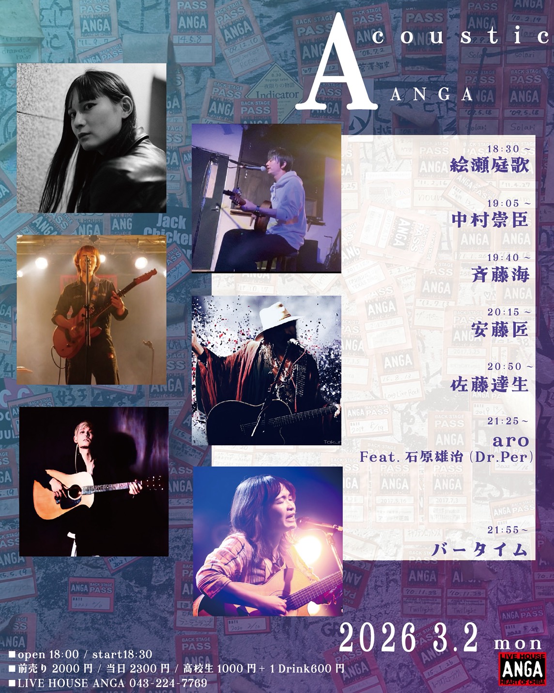 3月2日(月) 絵瀬庭歌 中村崇臣 齊藤海 安藤匠 佐藤達生 aro Feat.石原雄治(Dr.Per) ■前売り2,000円/当日2,300円 ※ドリンク券別 600円 チケットのご予約または各出演者まで