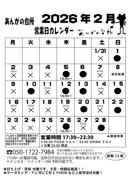 家庭料理とおばんざいとお酒「あんがの台所」の本店舗が決まりました。10/6(日)OPENになります。昔からの夢でありました居酒屋さんを開店することが出来ました。3月からレンタルスペースをお借りし、月に4回程度の営業でした。色々な縁が重なり、最初にやりたいと思っていた場所でオープンする運びとなりました。この縁を大事に毎日を重ねていきたいと思っております。懐にあったかい料金と美味しい食べ物でお家に帰ったようなお店を目指し頑張ろうと思ってます。場所は道路挟んでアンガの裏側になります。ライブ前、打ち上げなどにもぜひ。LIVE HOUSE ANGAのお仕事もありますので、週末など時間帯が不規則になりますが、毎月スケジュールを出しますのでチェックしてきてください。たくさん来てください。メニューは季節や気分に応じてちょいちょい変えていく予定です。席数が少なめなので、来るよって方はご予約いただけると心構えができますので、助かります。尚、OPEN日は完全予約制になっております。どうぞよろしくお願いします。各SNSで情報発信予定です。女将 中台奈央美